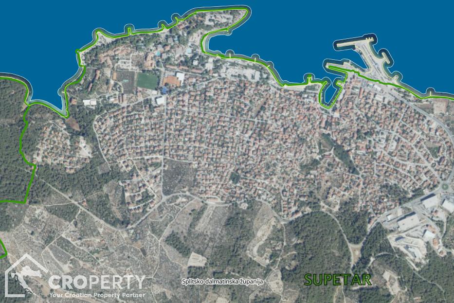 Zemljište se nalazi u M1 zoni, svega 600 metara od gradske plaže i 1,5 kilometar od centra Supetra i trajektne luke.