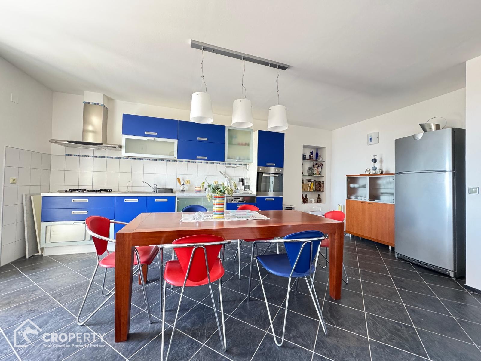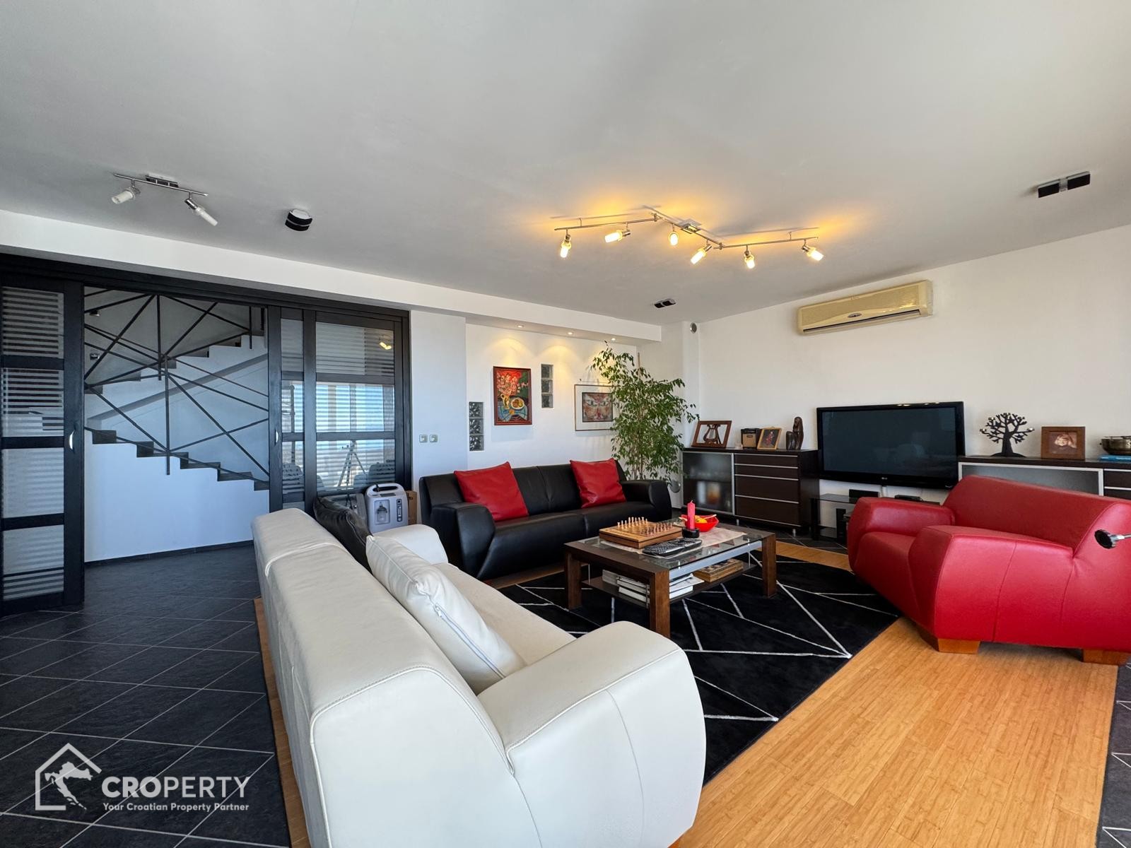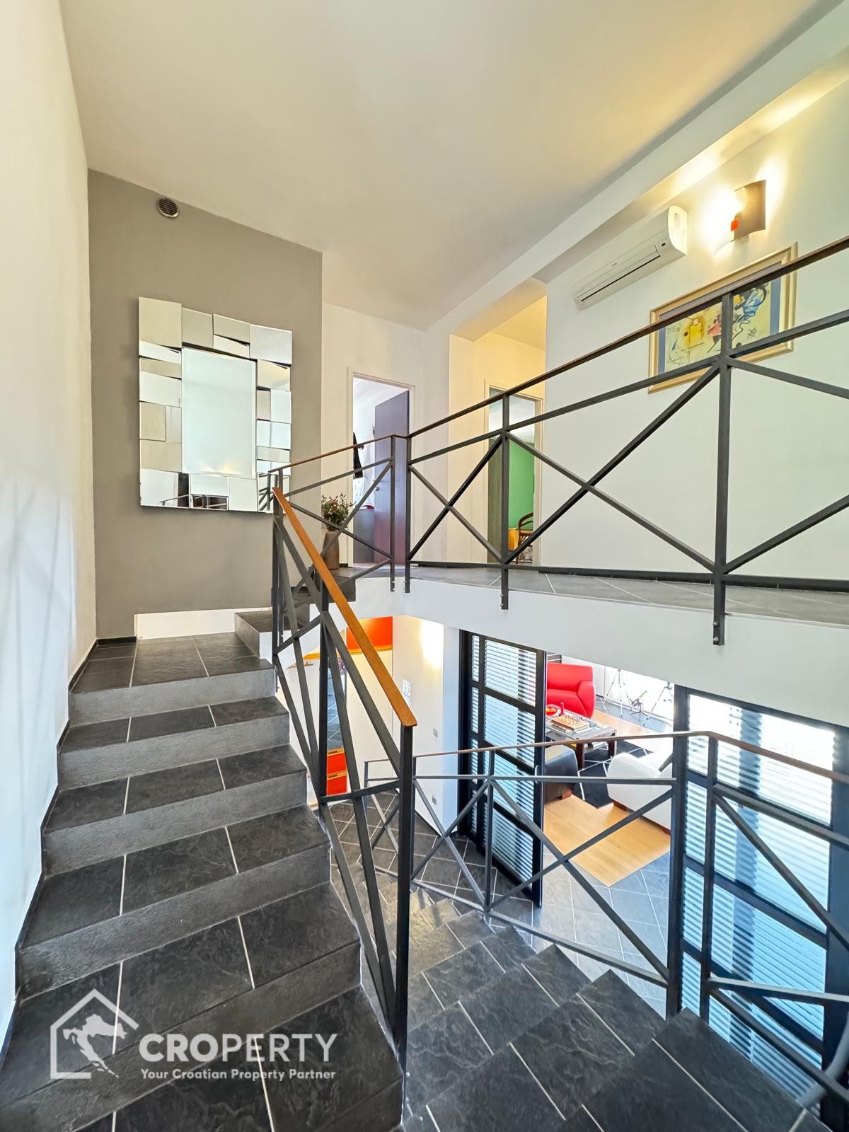 – dvoetažni stan se sastoji od dnevnog boravka 40m2 i kuhinje sa blagovaonom 25m2 koji su povezani prekrasnom terasom 35m2 s pogledom na more i grad. Tu je i kupatilo sa wc-om i unutarnje stepenice koje vode na drugi kat.