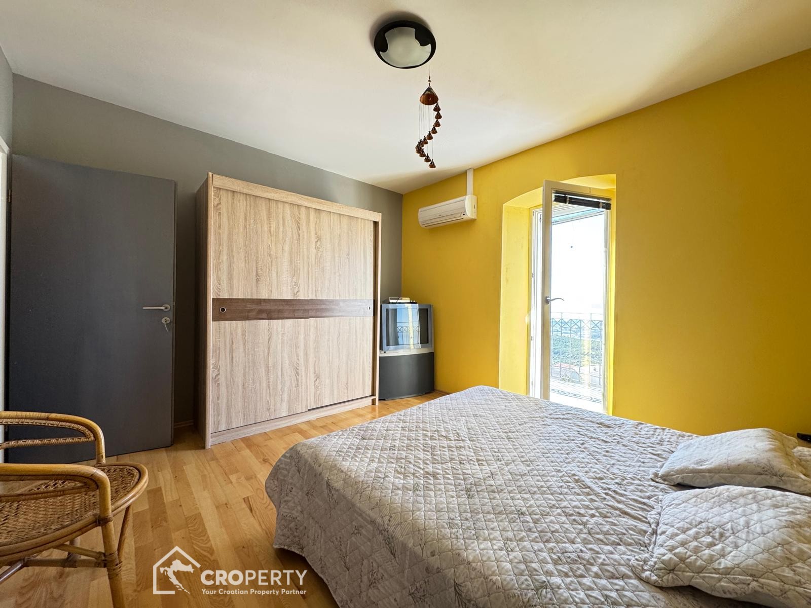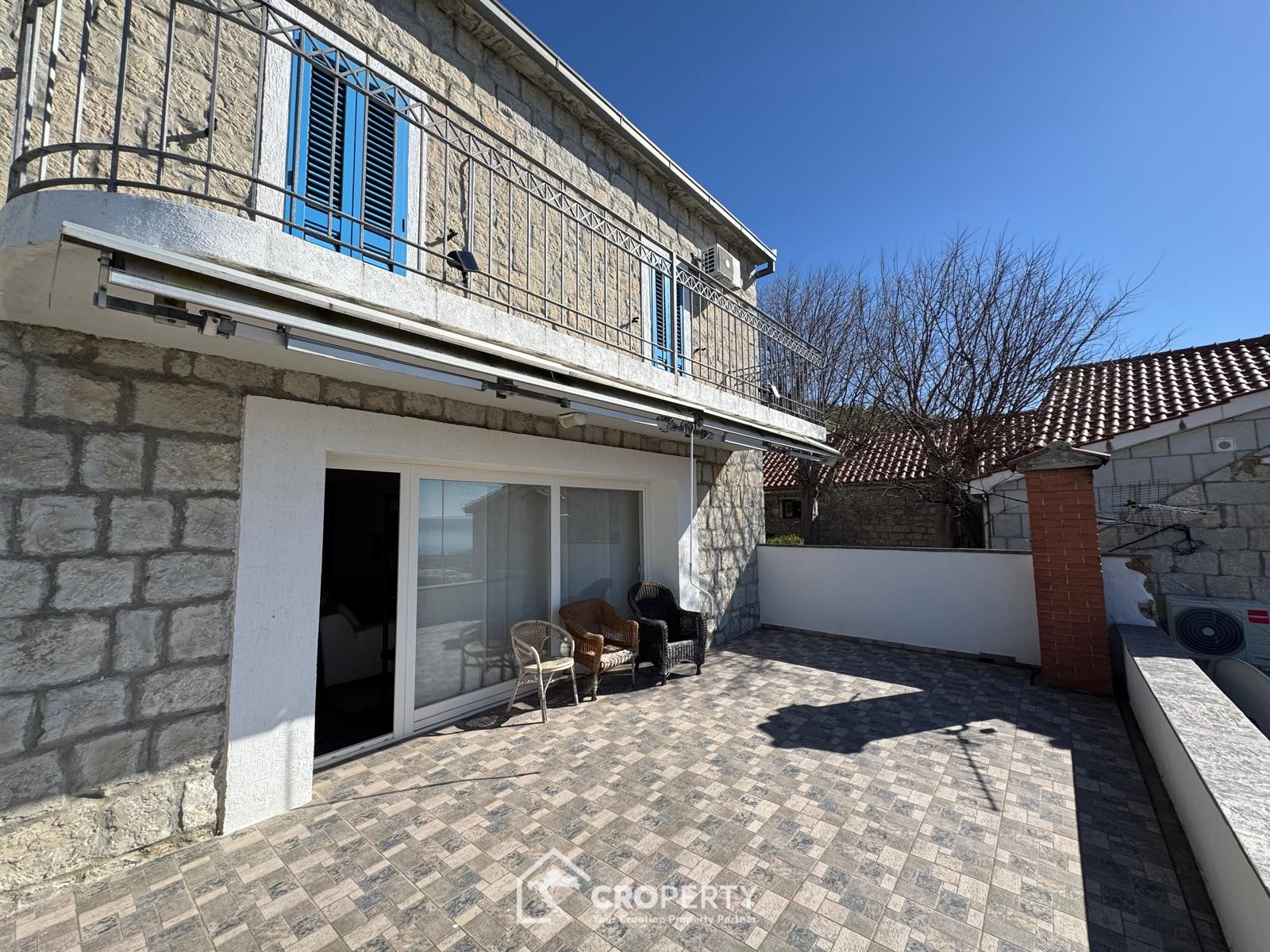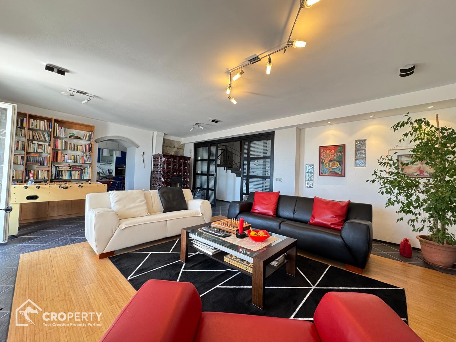 – dvoetažni stan se sastoji od dnevnog boravka 40m2 i kuhinje sa blagovaonom 25m2 koji su povezani prekrasnom terasom 35m2 s pogledom na more i grad. Tu je i kupatilo sa wc-om i unutarnje stepenice koje vode na drugi kat.