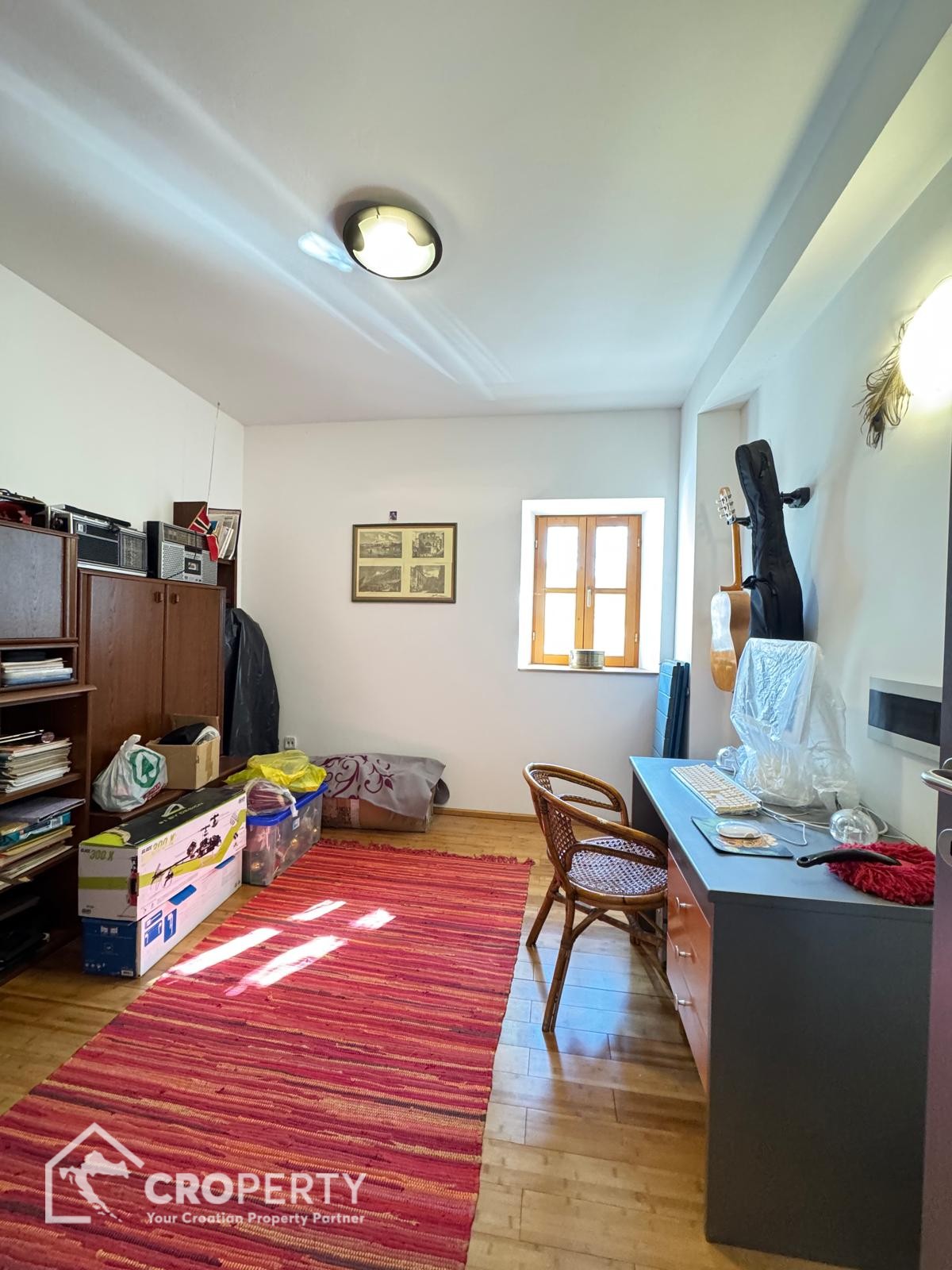 – dolazimo na drugi kat površine 70m2 sa tri spavaće sobe od kojih svaka ima svoje kupatilo sa wc-om i četvrtom radnom sobom, a po potrebi može biti i spavaća. Dvije sobe su povezane predivnim balkonima sa kovanom ogradom. Postoji i ulaz u potkrovlje koje je za sada neiskorišteno, te novi vlasnik može koristiti za razne namjene.