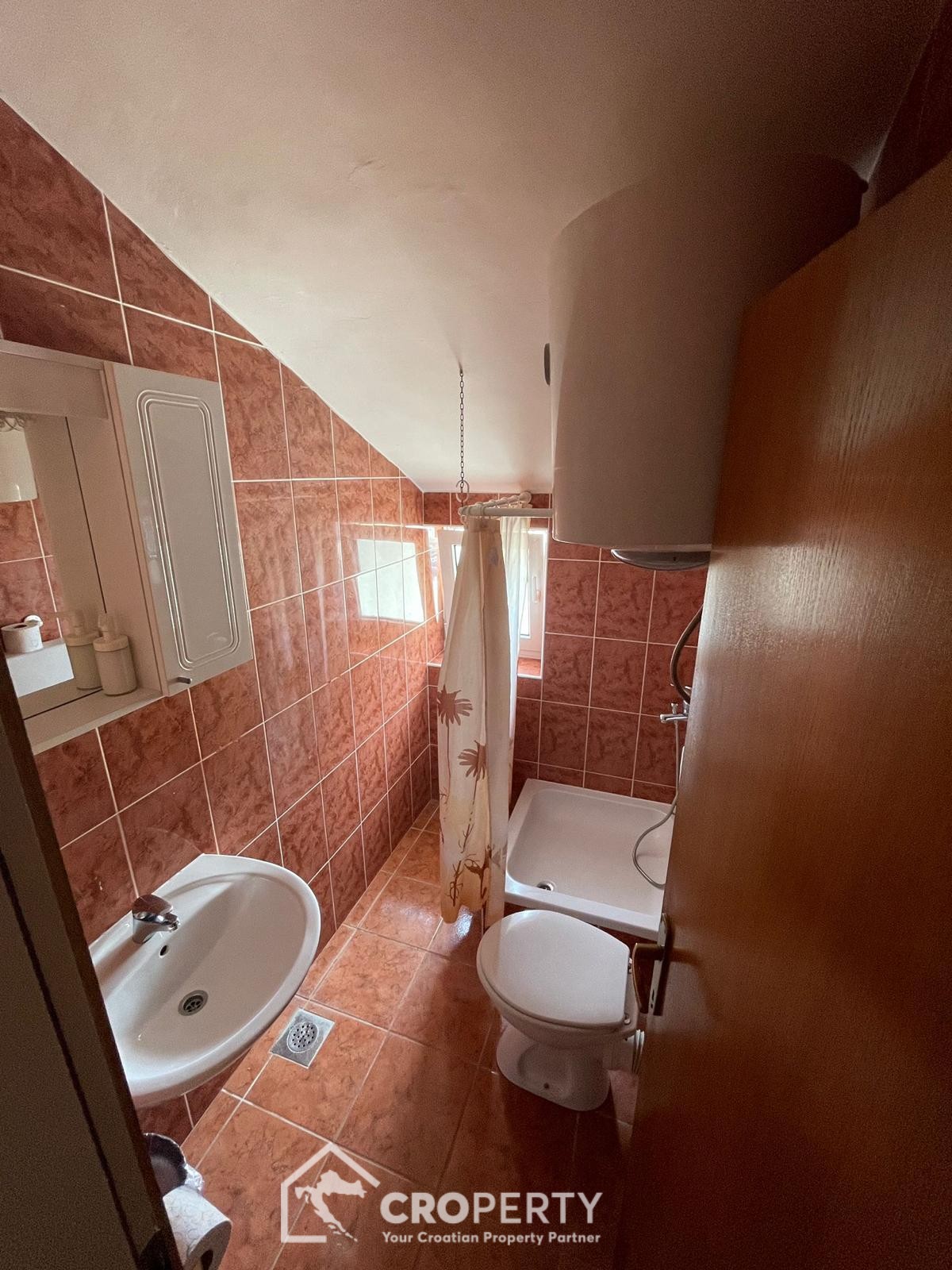 Stambeni dijelovi kuće prostiru se na više etaža, pažljivo osmišljeni kako bi pružili maksimalnu udobnost. Prizemni kat nudi skladan raspored: kuhinju, blagovaonicu, dnevni boravak, dvije spavaće sobe, dva sanitarna čvora, predsoblje i izlaz na prostranu terasu s očaravajućim pogledom na more.