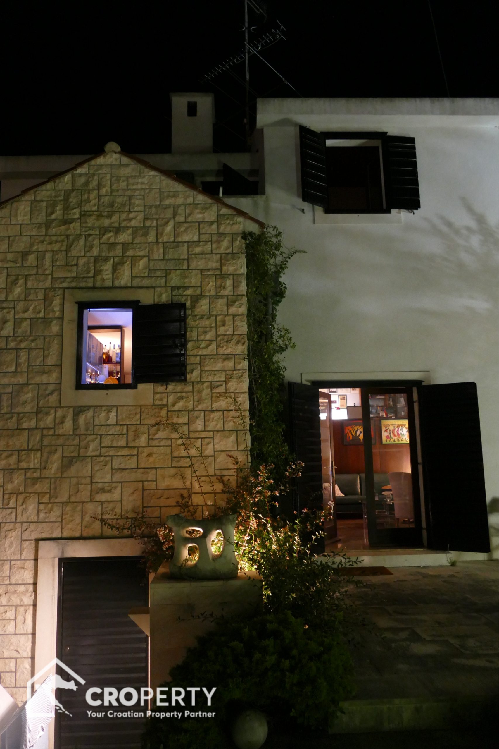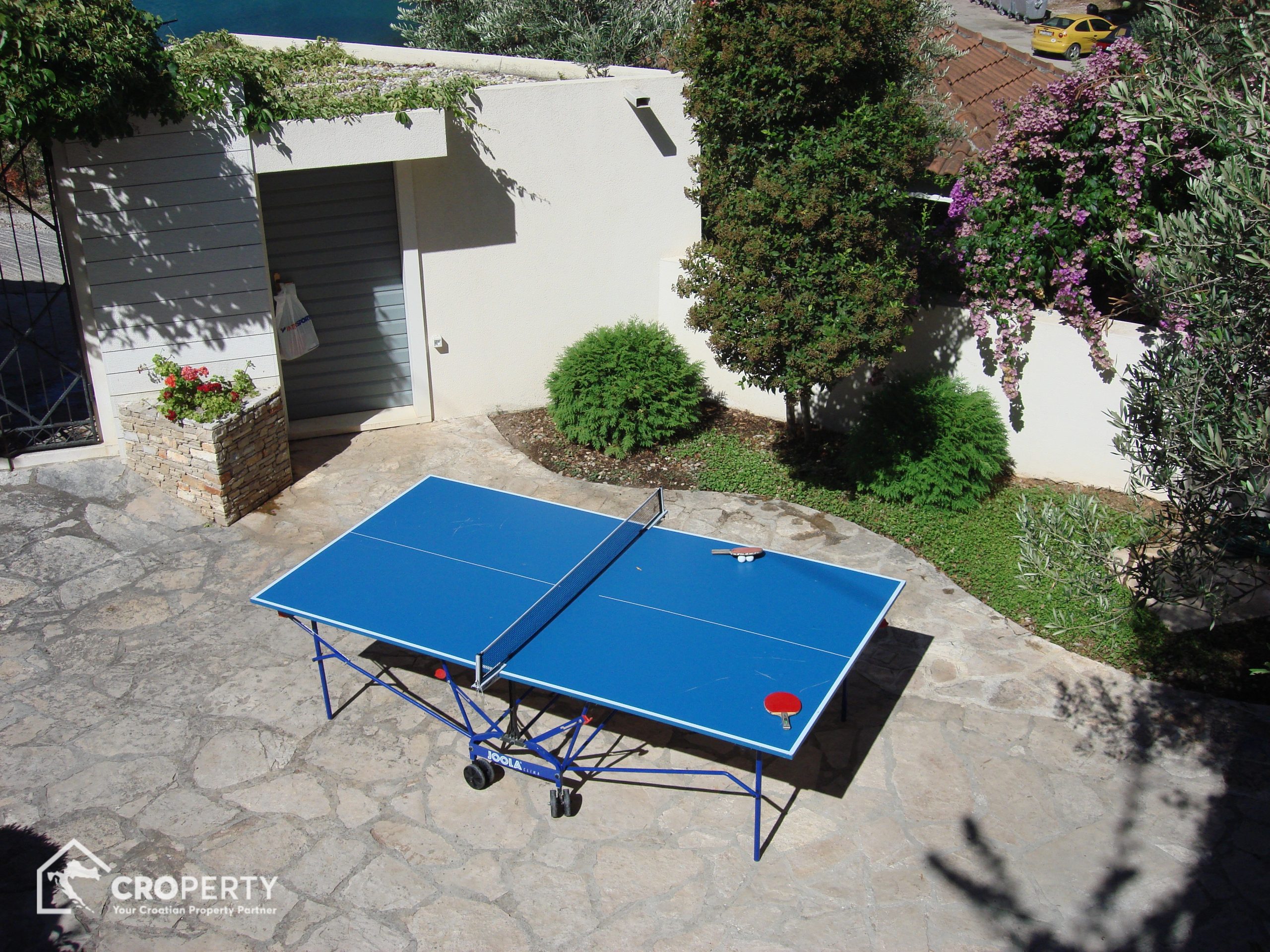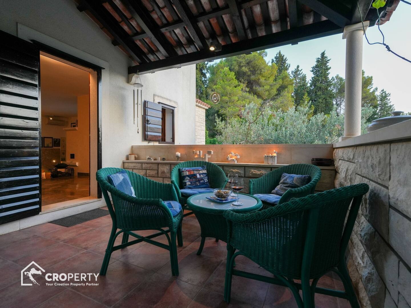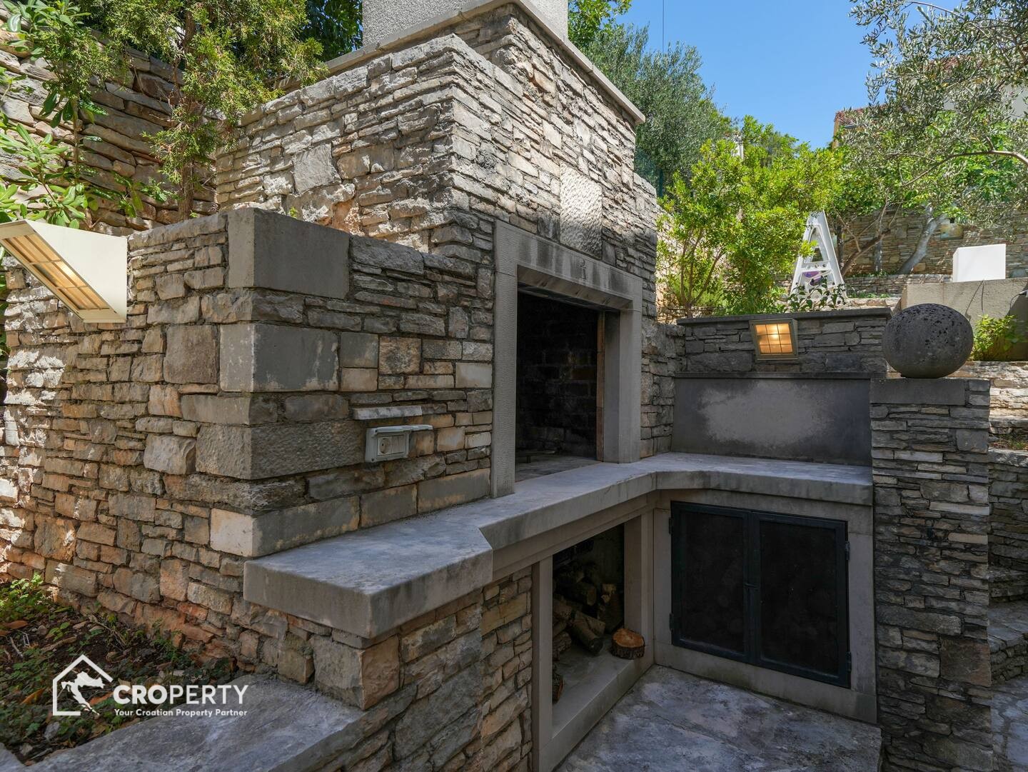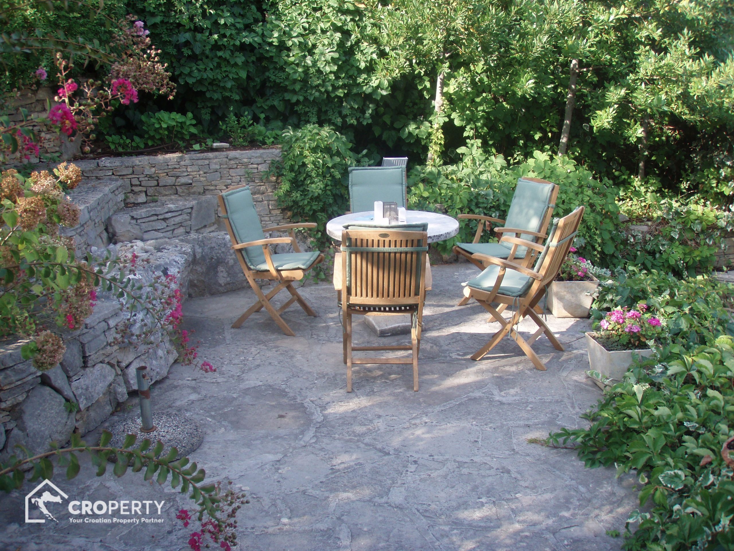 Uz kuću je povezana natkrivena terasa površine 20 m2 na razini prizemlja opremljena originalno dizajniranim kamenim stolom za blagovanje (10 osoba). Uz nju, nekoliko stepenica niže, vezuje se veća otvorena terasa s još većim originalno dizajniranim kamenim stolom za blagovanje (14 osoba), uz koju postoji zidani roštilj s „ljetnom kuhinjom“. Na razini niskog prizemlja je natkrivena terasa s roštiljem, površine cca 8 m2. Na prvom podu je mala terasa s prekrasnim pogledom na uvalu.