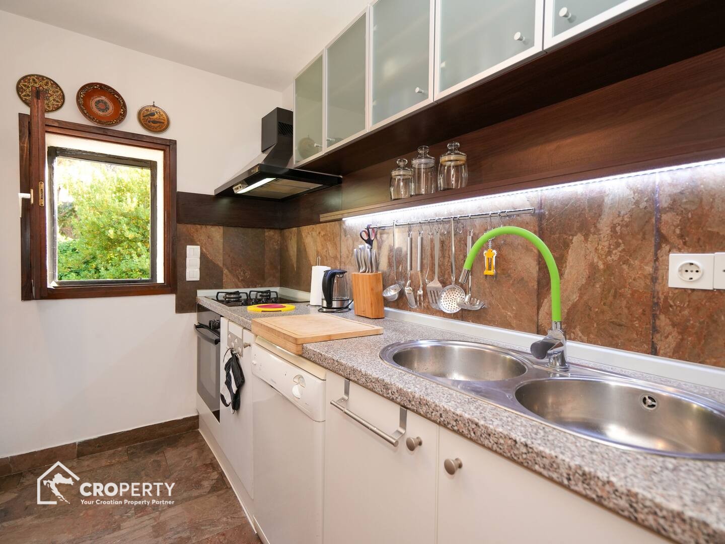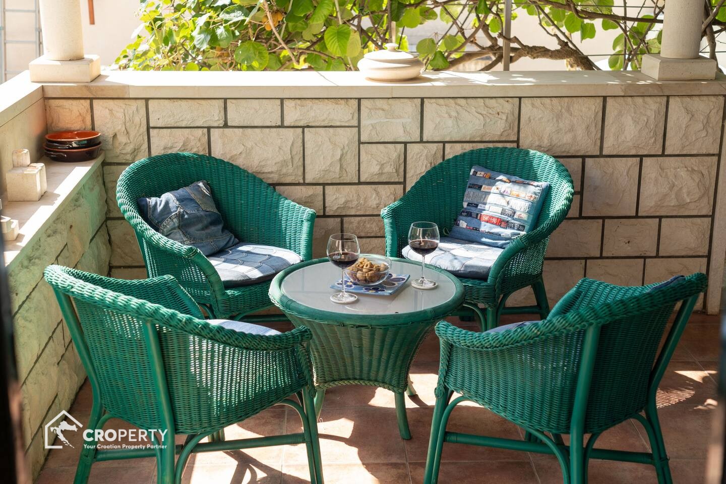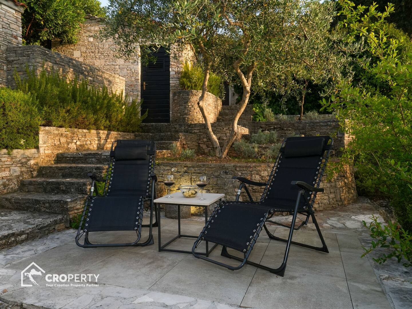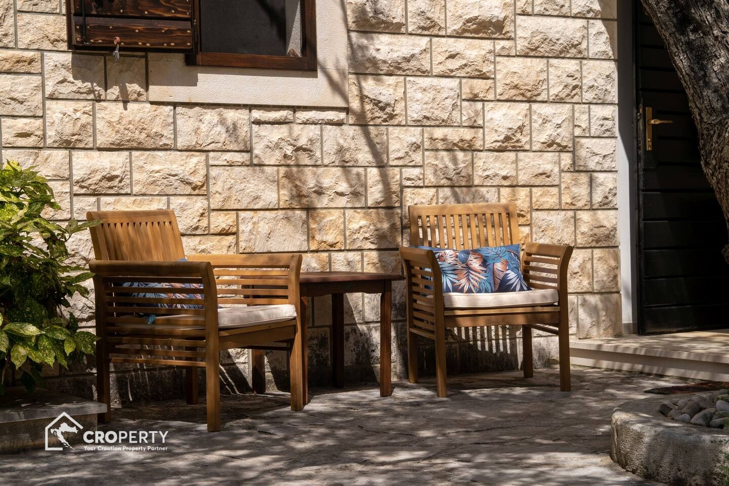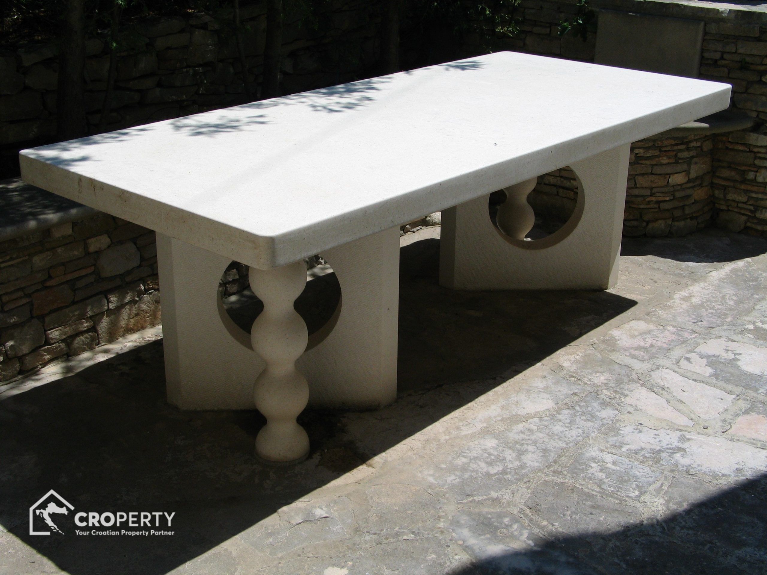 Uz kuću je povezana natkrivena terasa površine 20 m2 na razini prizemlja opremljena originalno dizajniranim kamenim stolom za blagovanje (10 osoba). Uz nju, nekoliko stepenica niže, vezuje se veća otvorena terasa s još većim originalno dizajniranim kamenim stolom za blagovanje (14 osoba), uz koju postoji zidani roštilj s „ljetnom kuhinjom“. Na razini niskog prizemlja je natkrivena terasa s roštiljem, površine cca 8 m2. Na prvom podu je mala terasa s prekrasnim pogledom na uvalu.