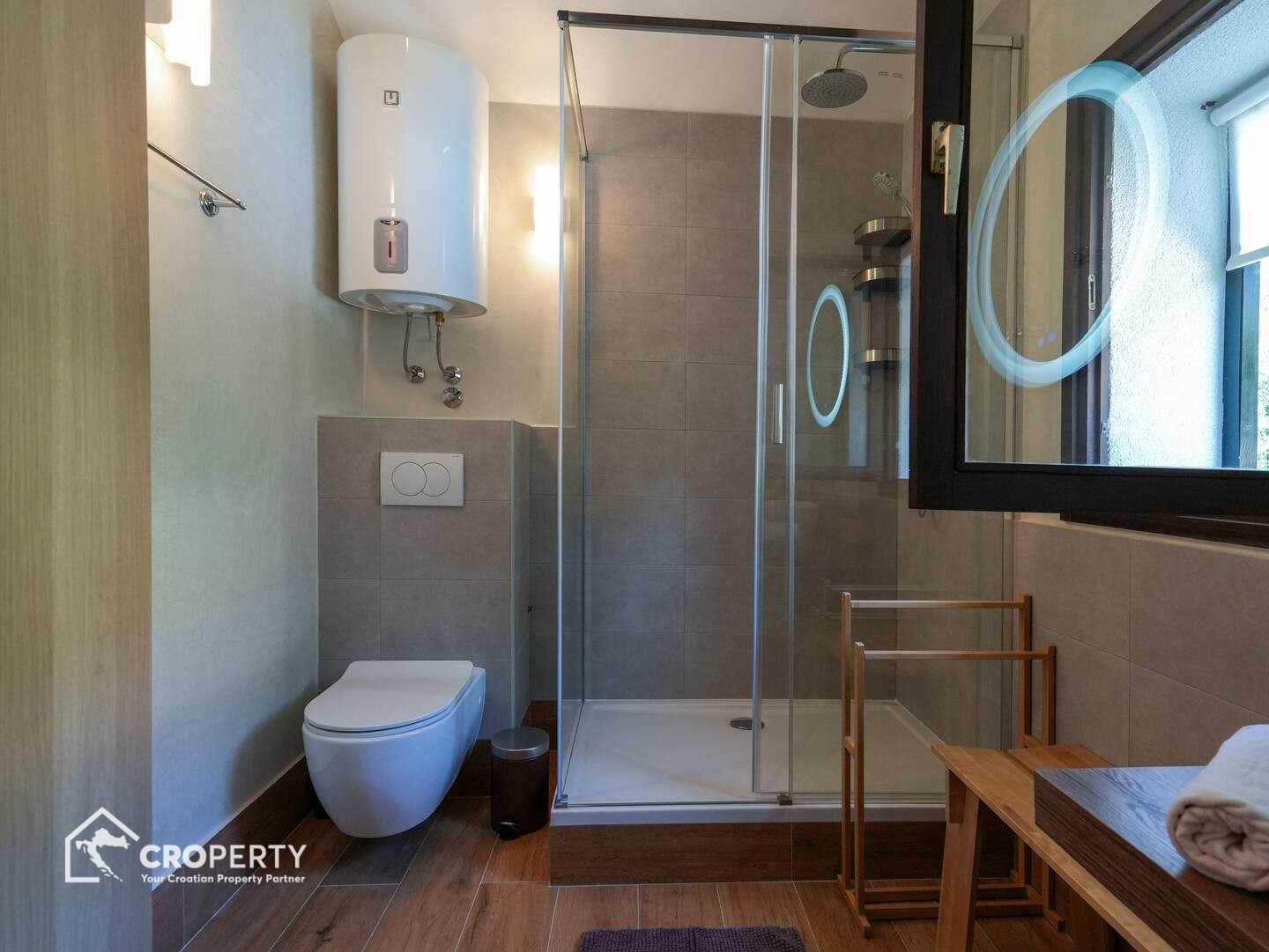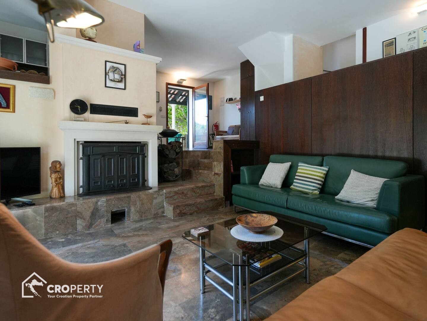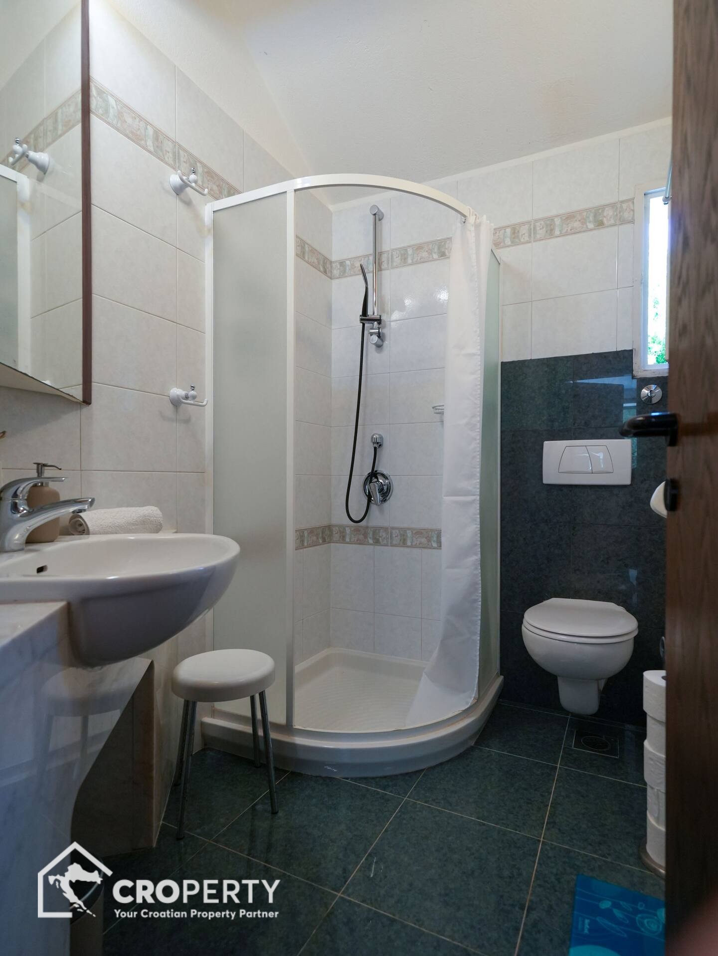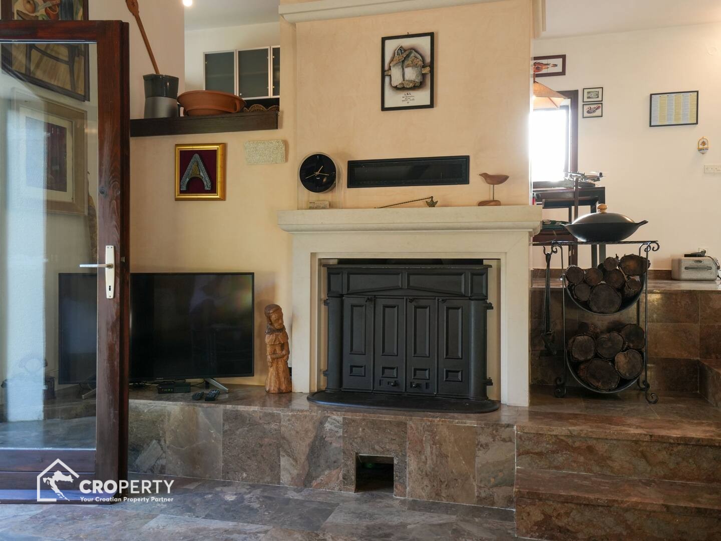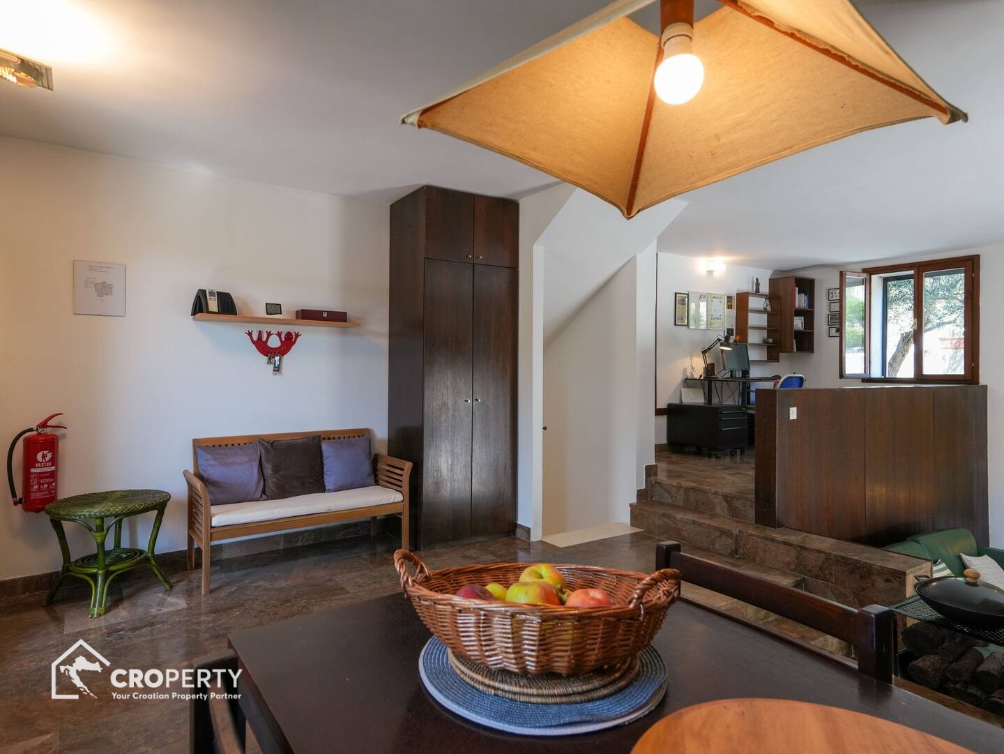 Uz kuću je povezana natkrivena terasa površine 20 m2 na razini prizemlja opremljena originalno dizajniranim kamenim stolom za blagovanje (10 osoba). Uz nju, nekoliko stepenica niže, vezuje se veća otvorena terasa s još većim originalno dizajniranim kamenim stolom za blagovanje (14 osoba), uz koju postoji zidani roštilj s „ljetnom kuhinjom“. Na razini niskog prizemlja je natkrivena terasa s roštiljem, površine cca 8 m2. Na prvom podu je mala terasa s prekrasnim pogledom na uvalu.
