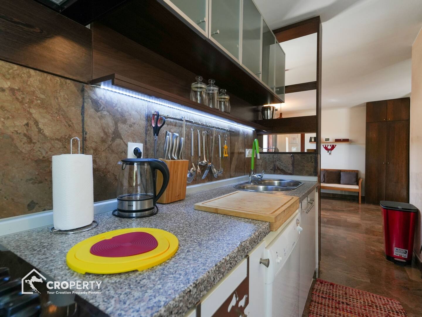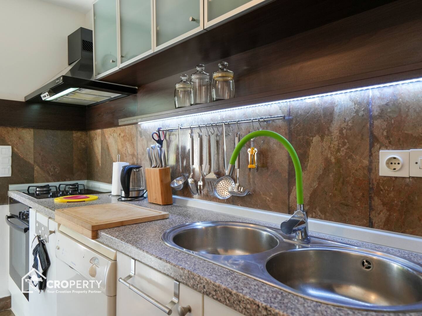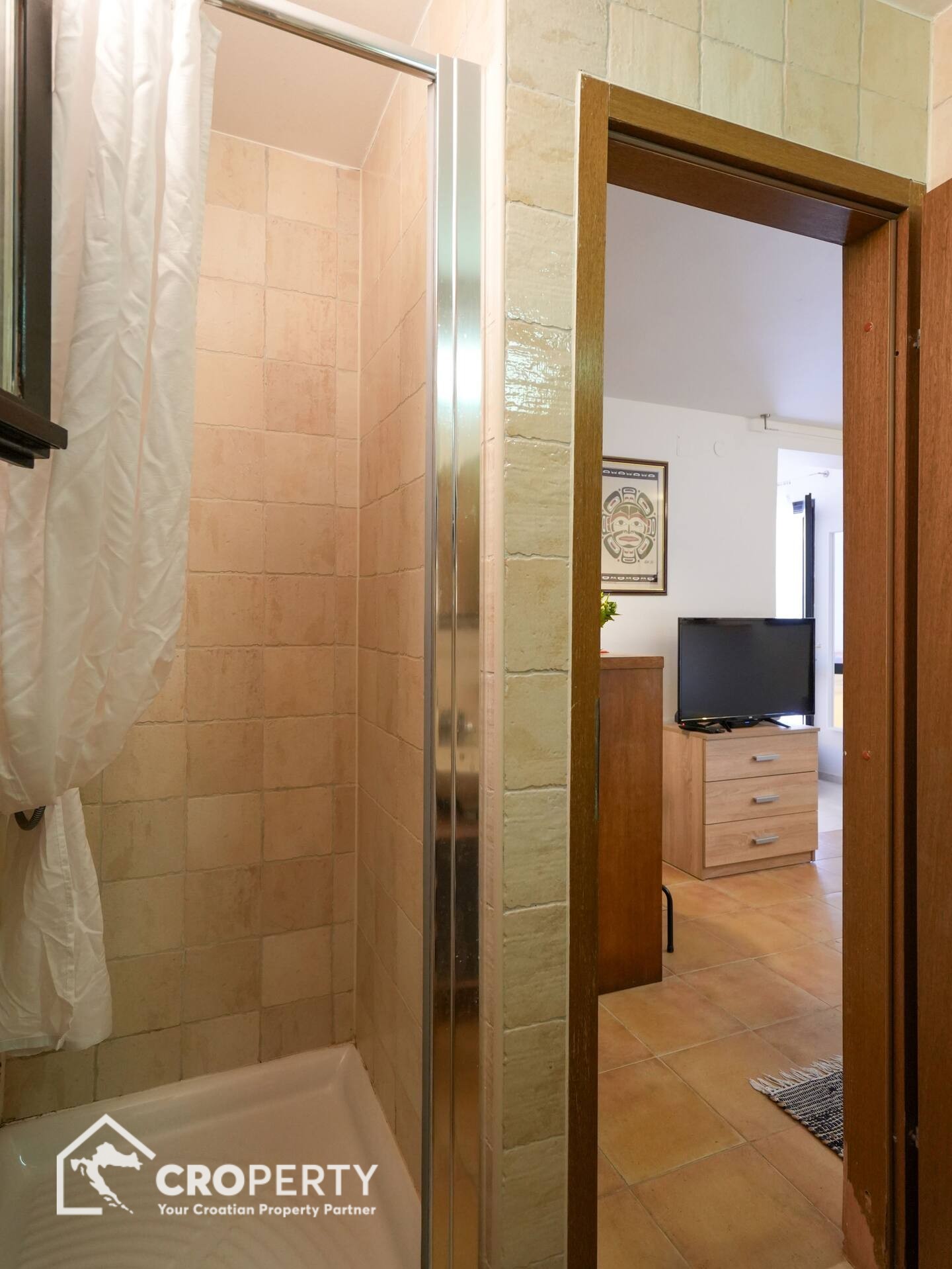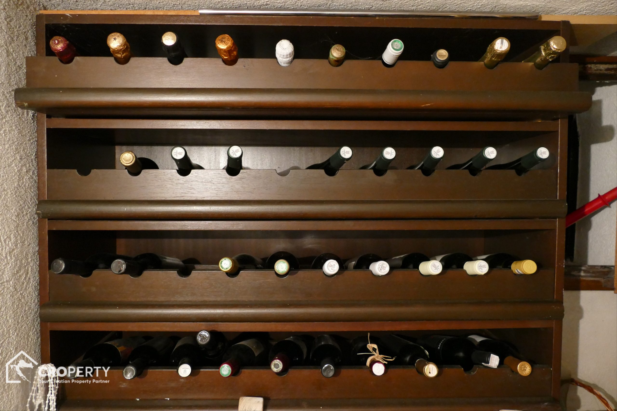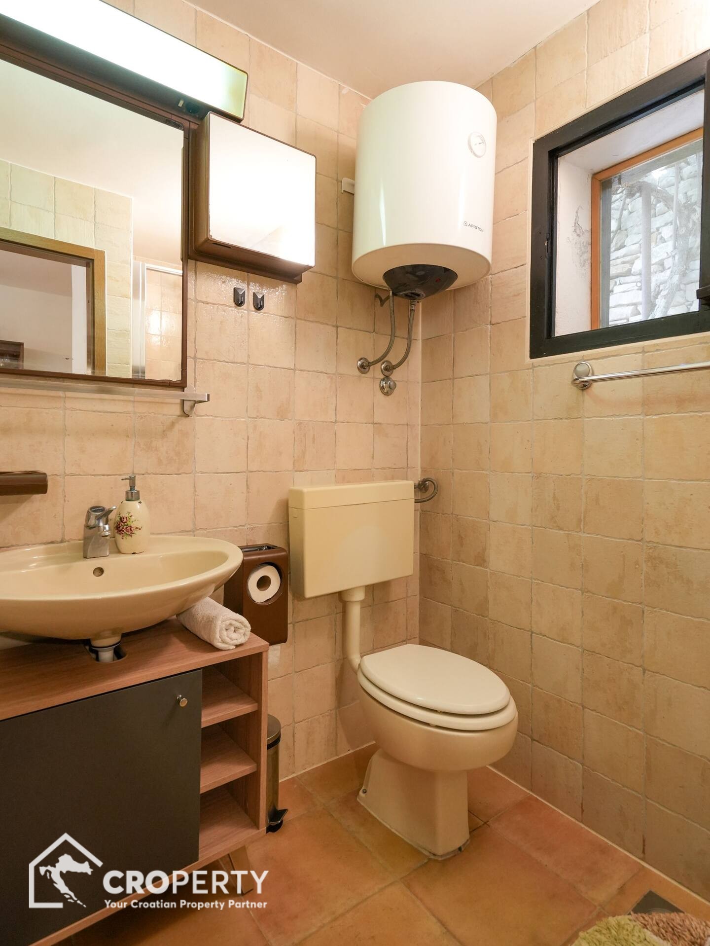 Uz kuću je povezana natkrivena terasa površine 20 m2 na razini prizemlja opremljena originalno dizajniranim kamenim stolom za blagovanje (10 osoba). Uz nju, nekoliko stepenica niže, vezuje se veća otvorena terasa s još većim originalno dizajniranim kamenim stolom za blagovanje (14 osoba), uz koju postoji zidani roštilj s „ljetnom kuhinjom“. Na razini niskog prizemlja je natkrivena terasa s roštiljem, površine cca 8 m2. Na prvom podu je mala terasa s prekrasnim pogledom na uvalu.