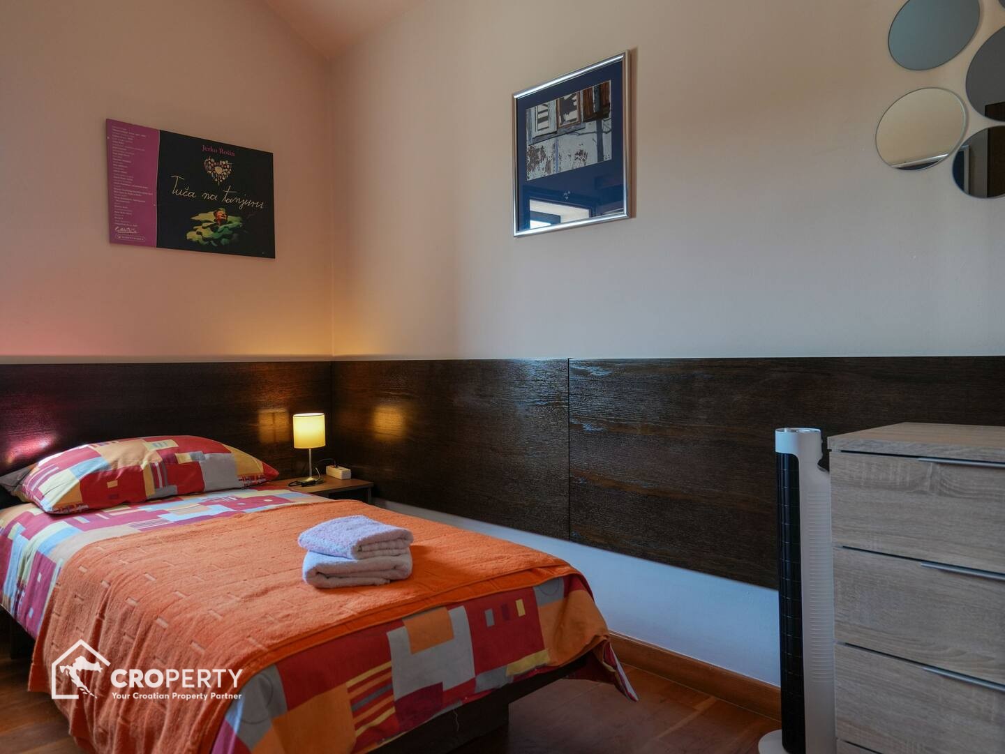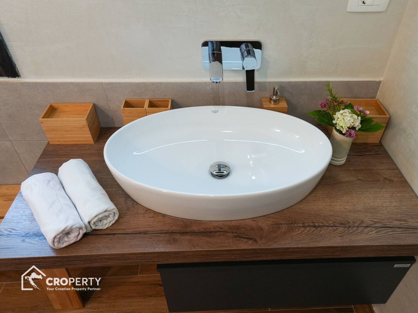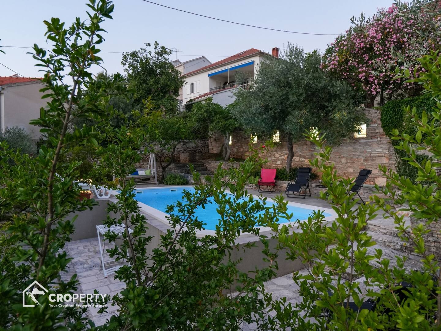 Sastavni dio vanjskog prostora je i otvoreni bazen s uređenim pripadajućim terasama i adekvatnom strojarnicom. Vodena površina bazena je 7,50×3,50 m, dubine 145 cm.