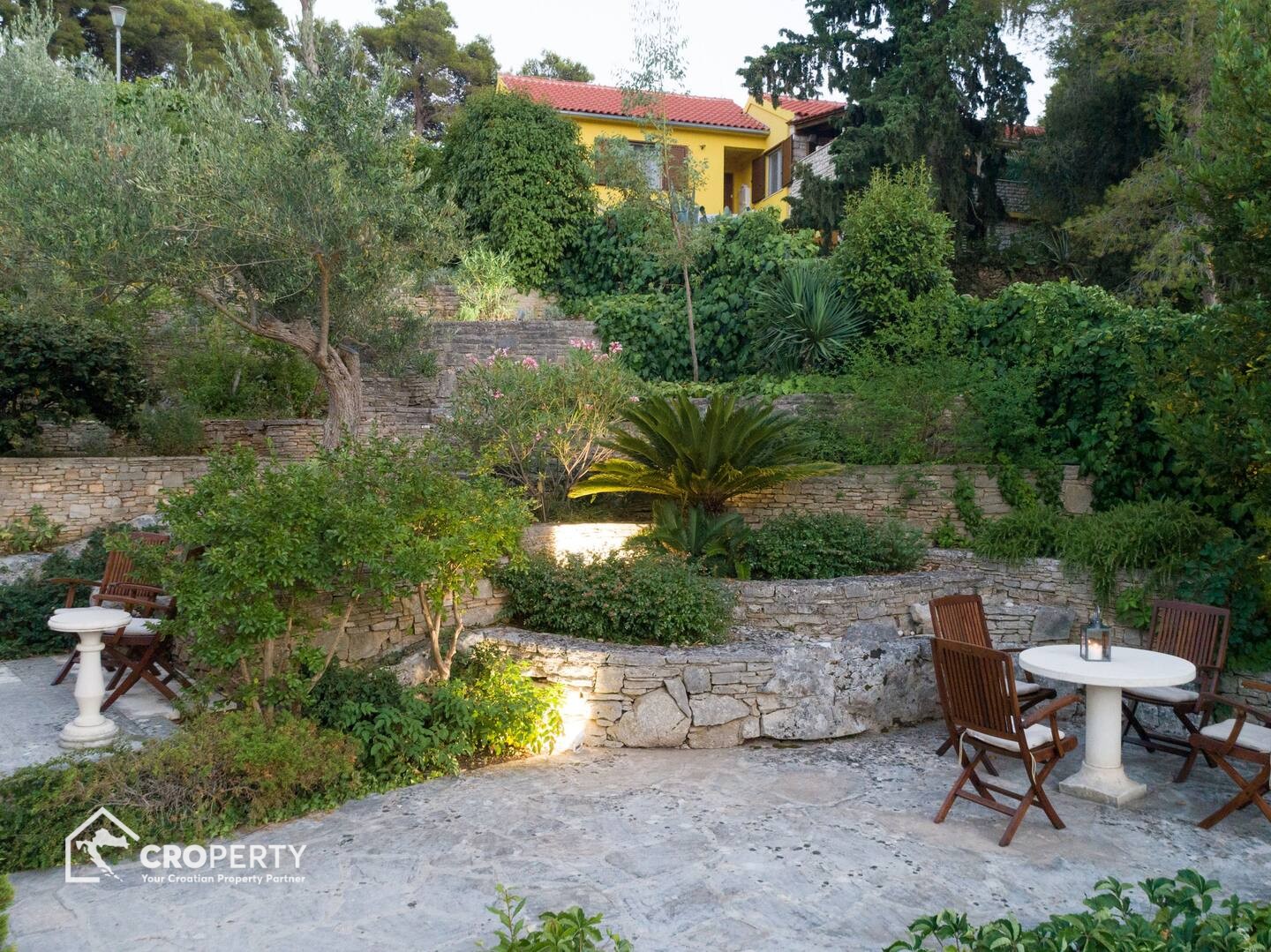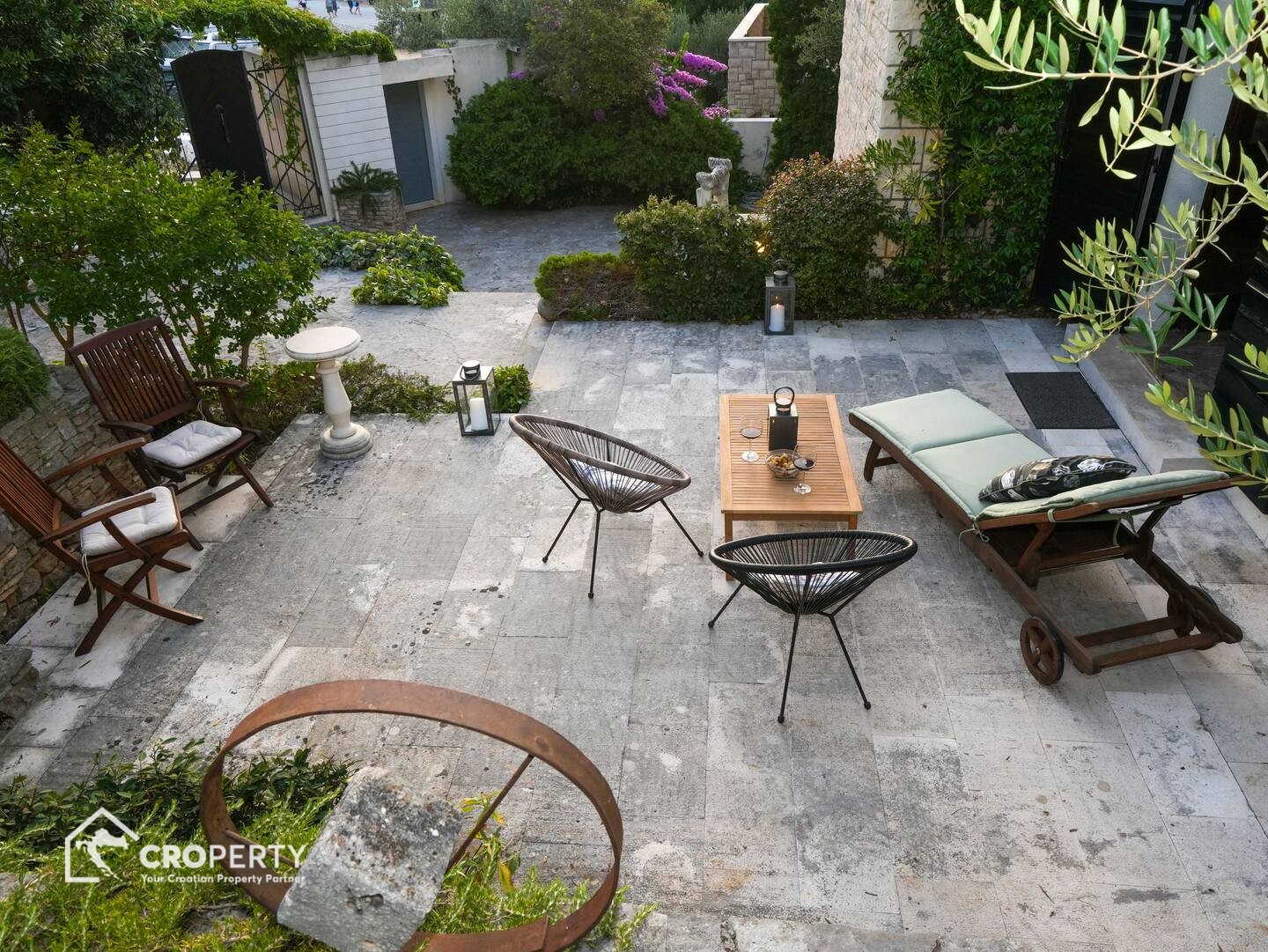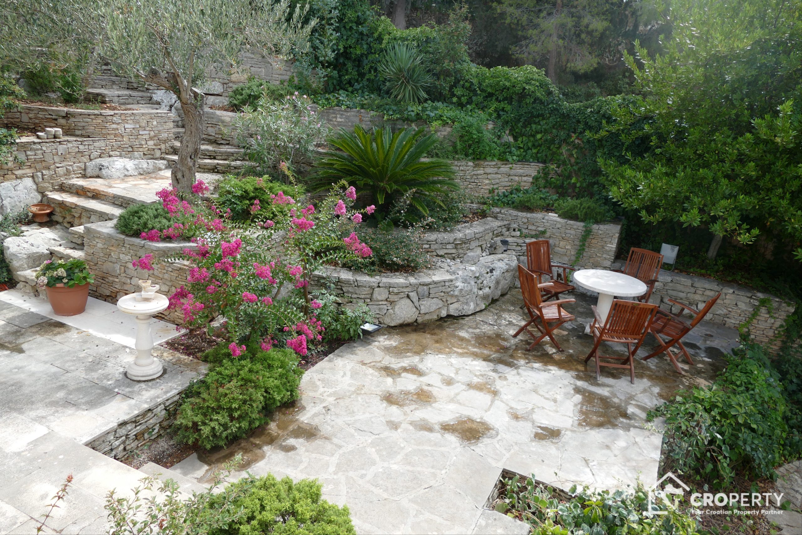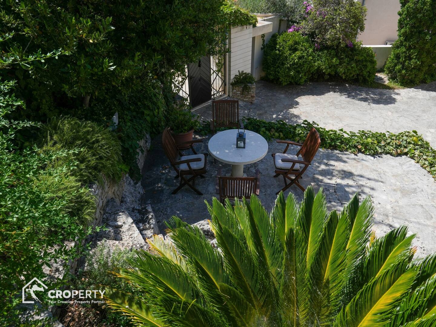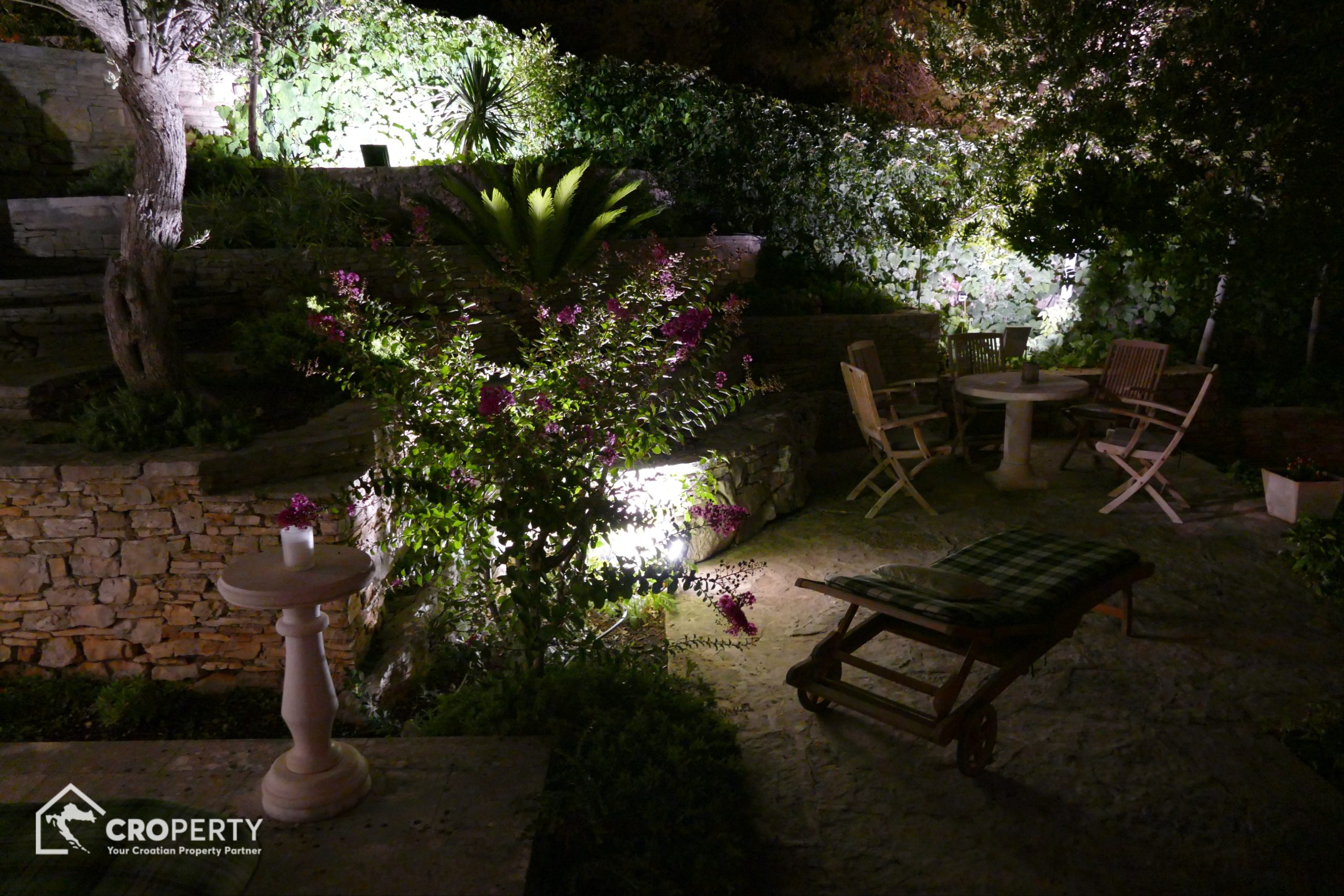 Vanjski prostor je visokim ogradama u kombinaciji zidova i zelenila zaštićen od vanjskog pogleda. Kaskadno je uređen s likovno pomno sazidanim kamenim zidovima na temu uredne suho-zidne gradnje i s kamenim podovima te hortikulturno uređenim vrtom. Uz to u vrtnom djelu postoji pet stabala maslina, te po jedna voćka limuna mjesečara, naranče, grejpa, kunkvaja, smokve, planike i tri stabljike kivija. Glavni ulaz (postoji i pomoćni) natkriven je divljom i pitomom lozom bijelog grožđa.