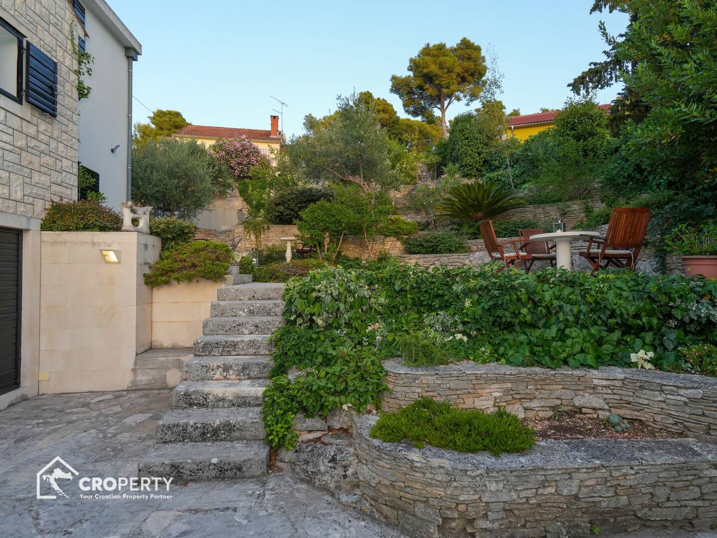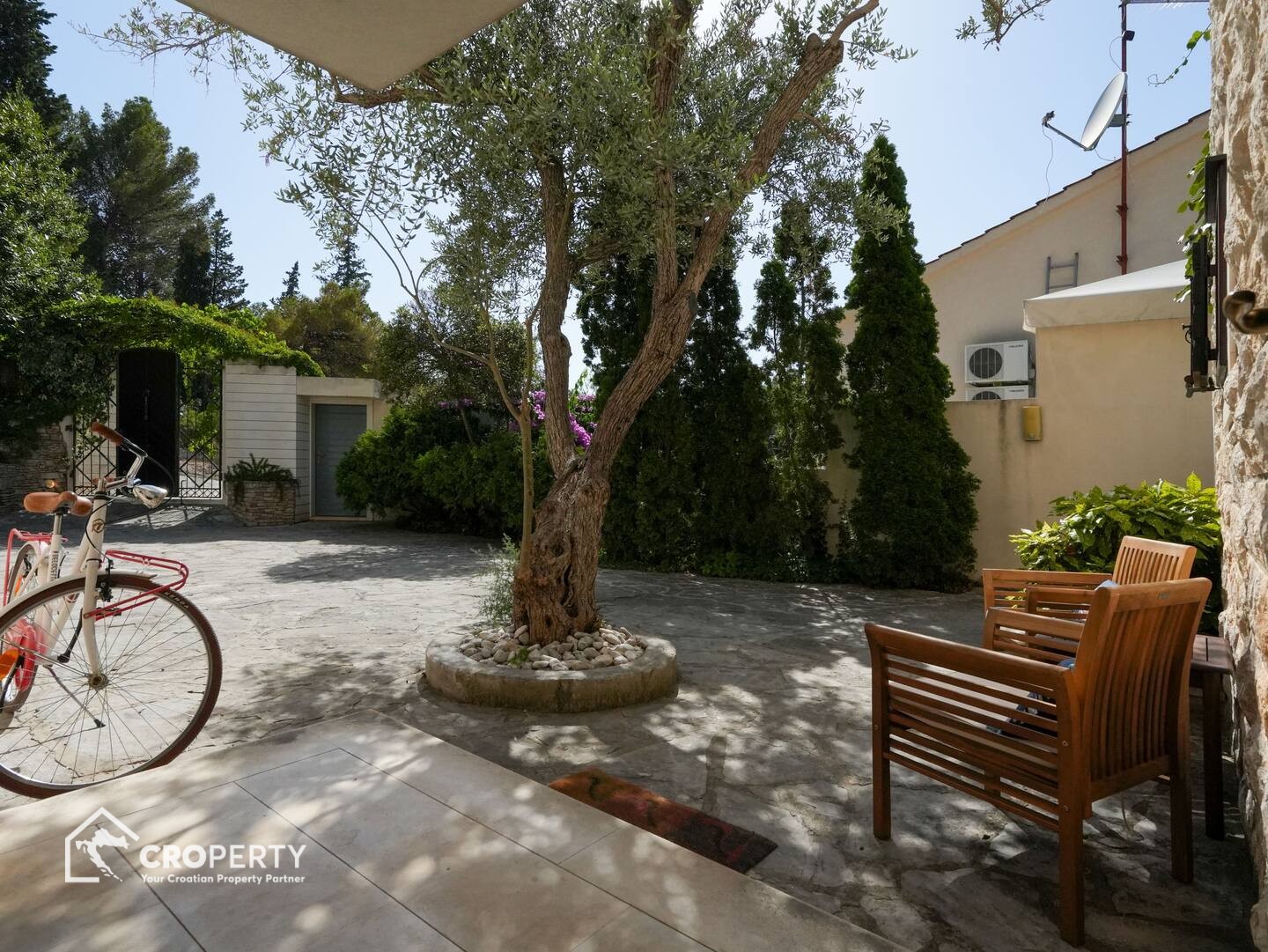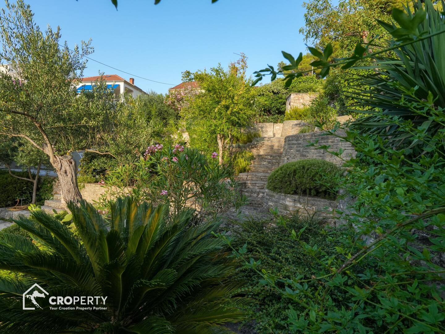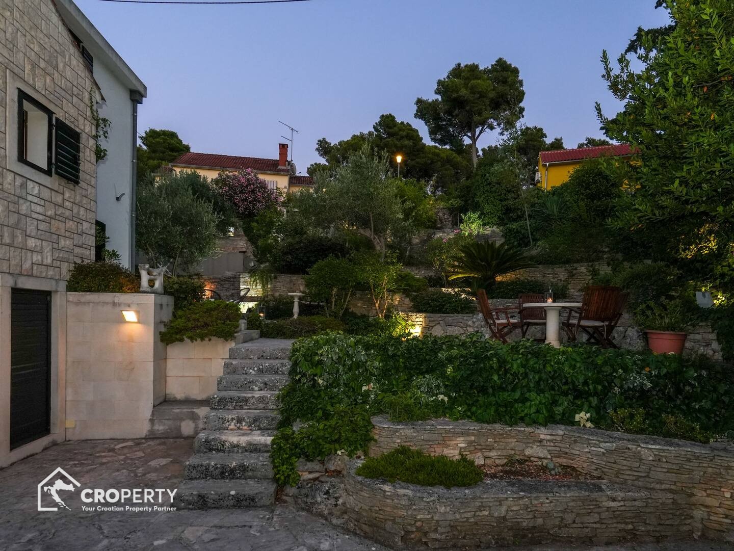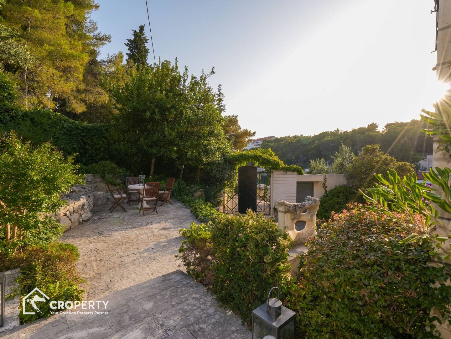 Vanjski prostor je visokim ogradama u kombinaciji zidova i zelenila zaštićen od vanjskog pogleda. Kaskadno je uređen s likovno pomno sazidanim kamenim zidovima na temu uredne suho-zidne gradnje i s kamenim podovima te hortikulturno uređenim vrtom. Uz to u vrtnom djelu postoji pet stabala maslina, te po jedna voćka limuna mjesečara, naranče, grejpa, kunkvaja, smokve, planike i tri stabljike kivija. Glavni ulaz (postoji i pomoćni) natkriven je divljom i pitomom lozom bijelog grožđa.
