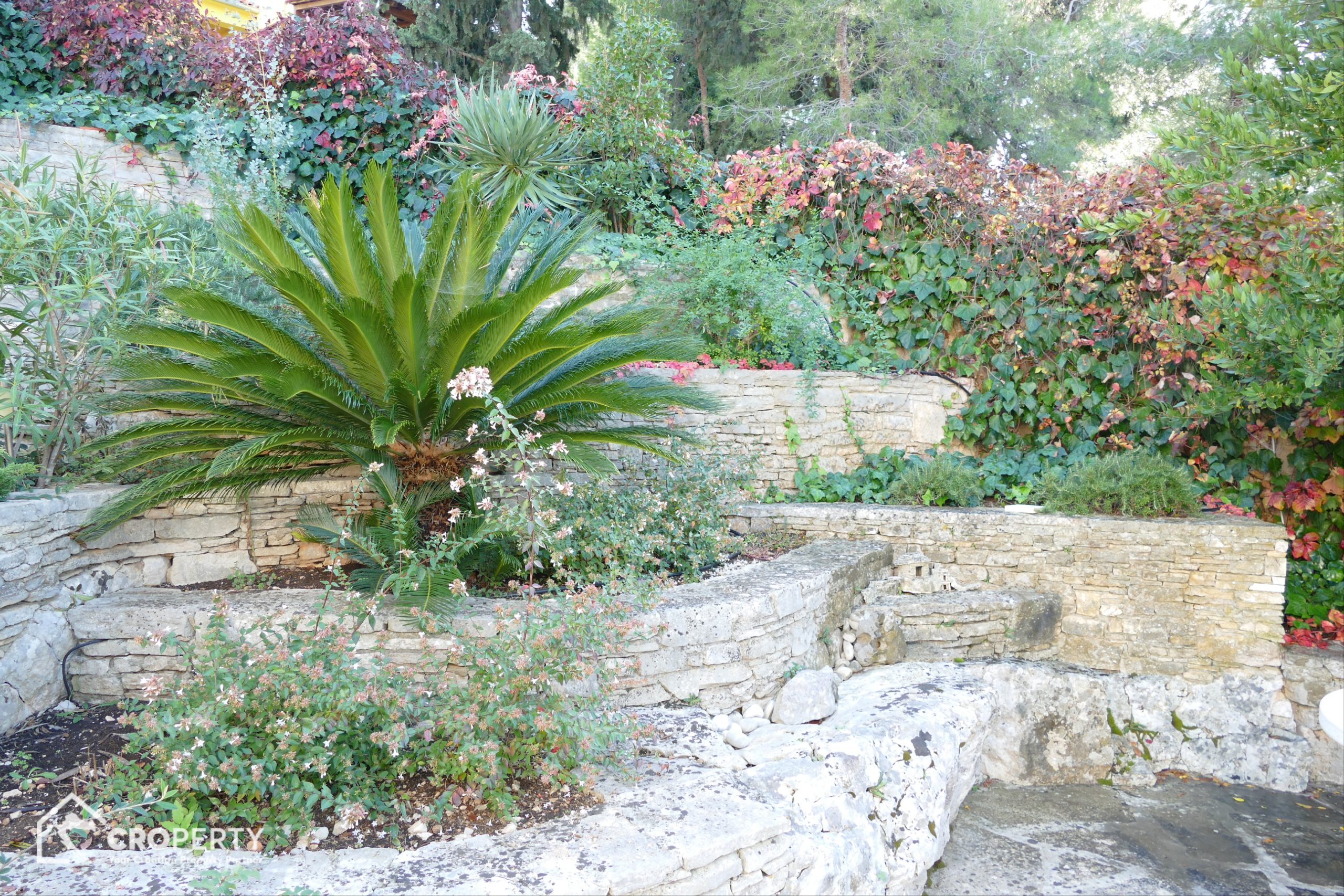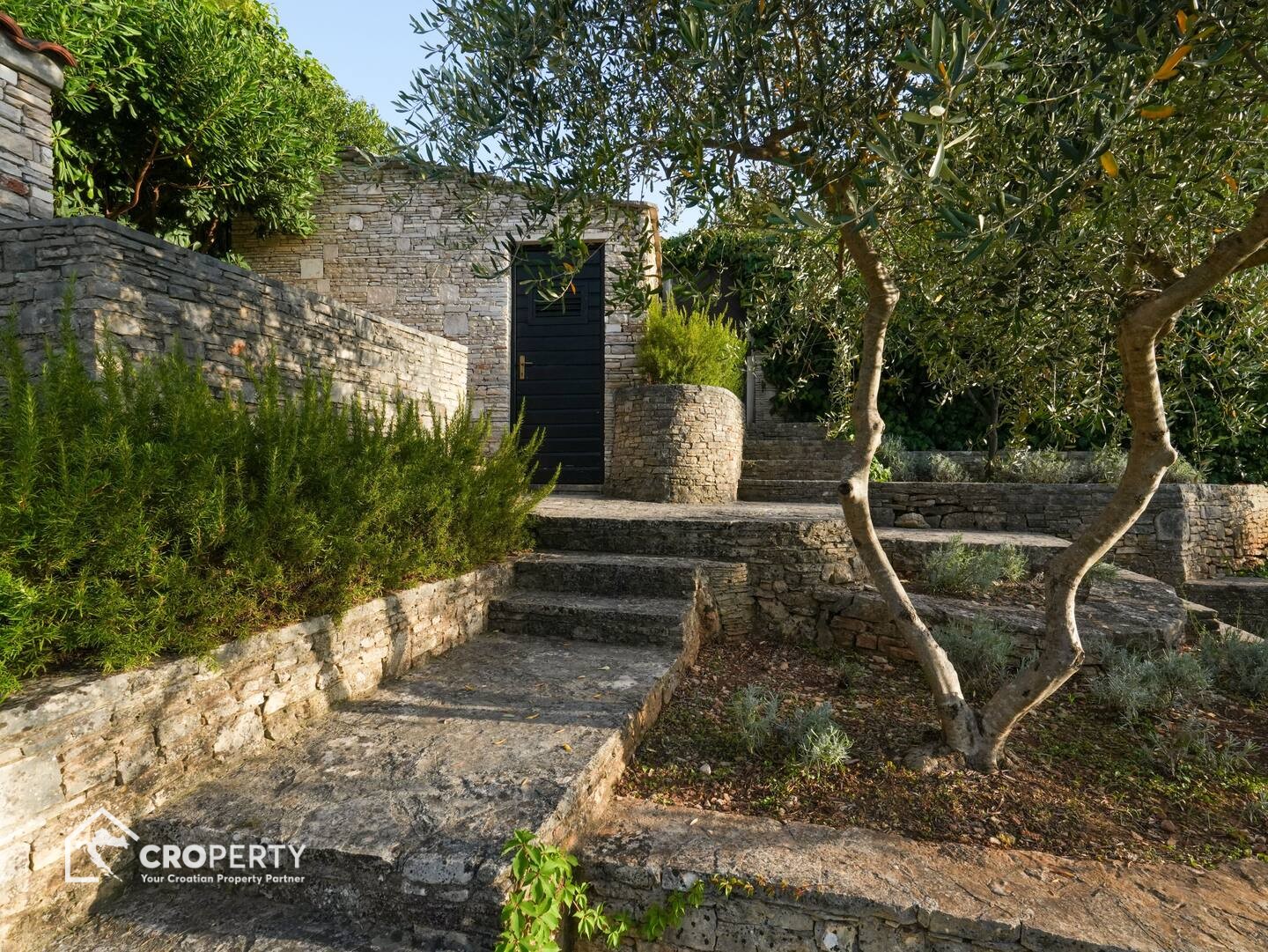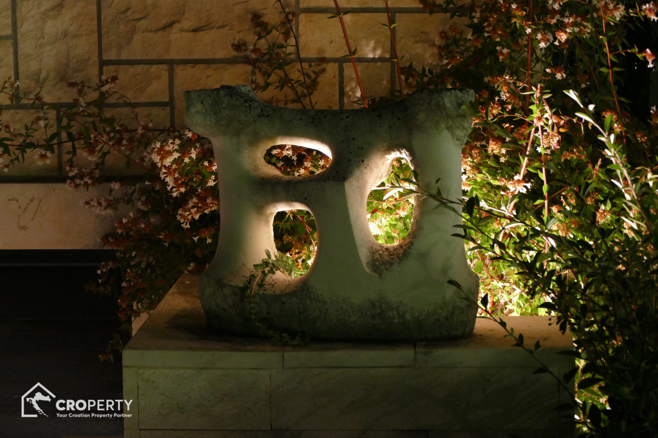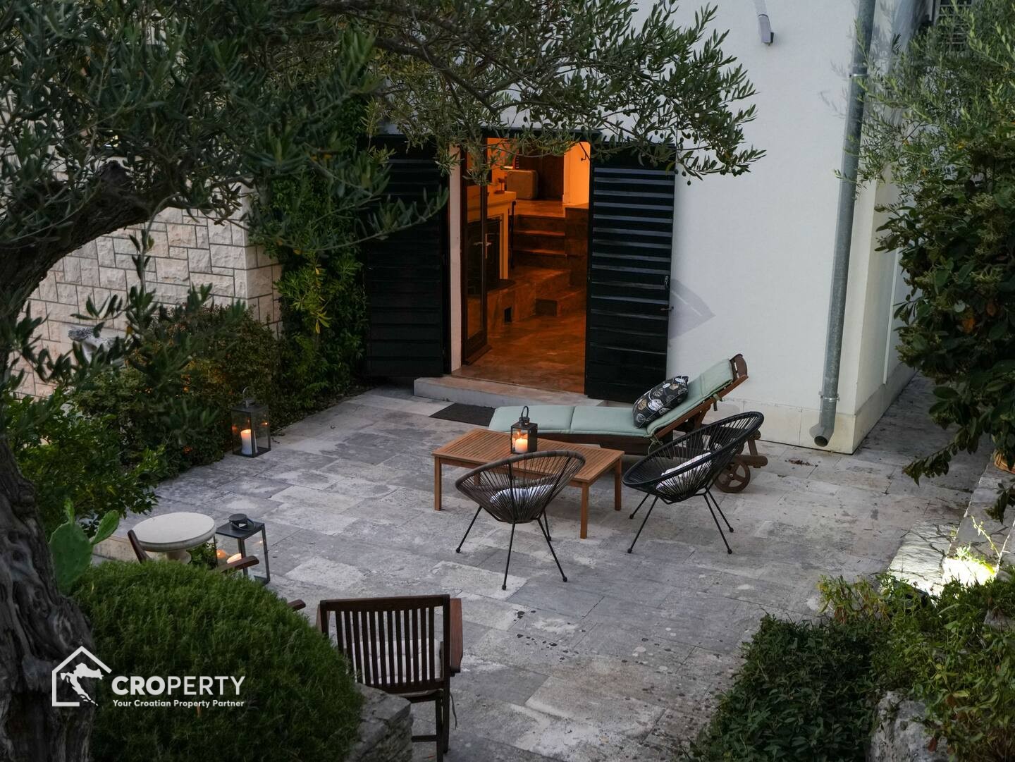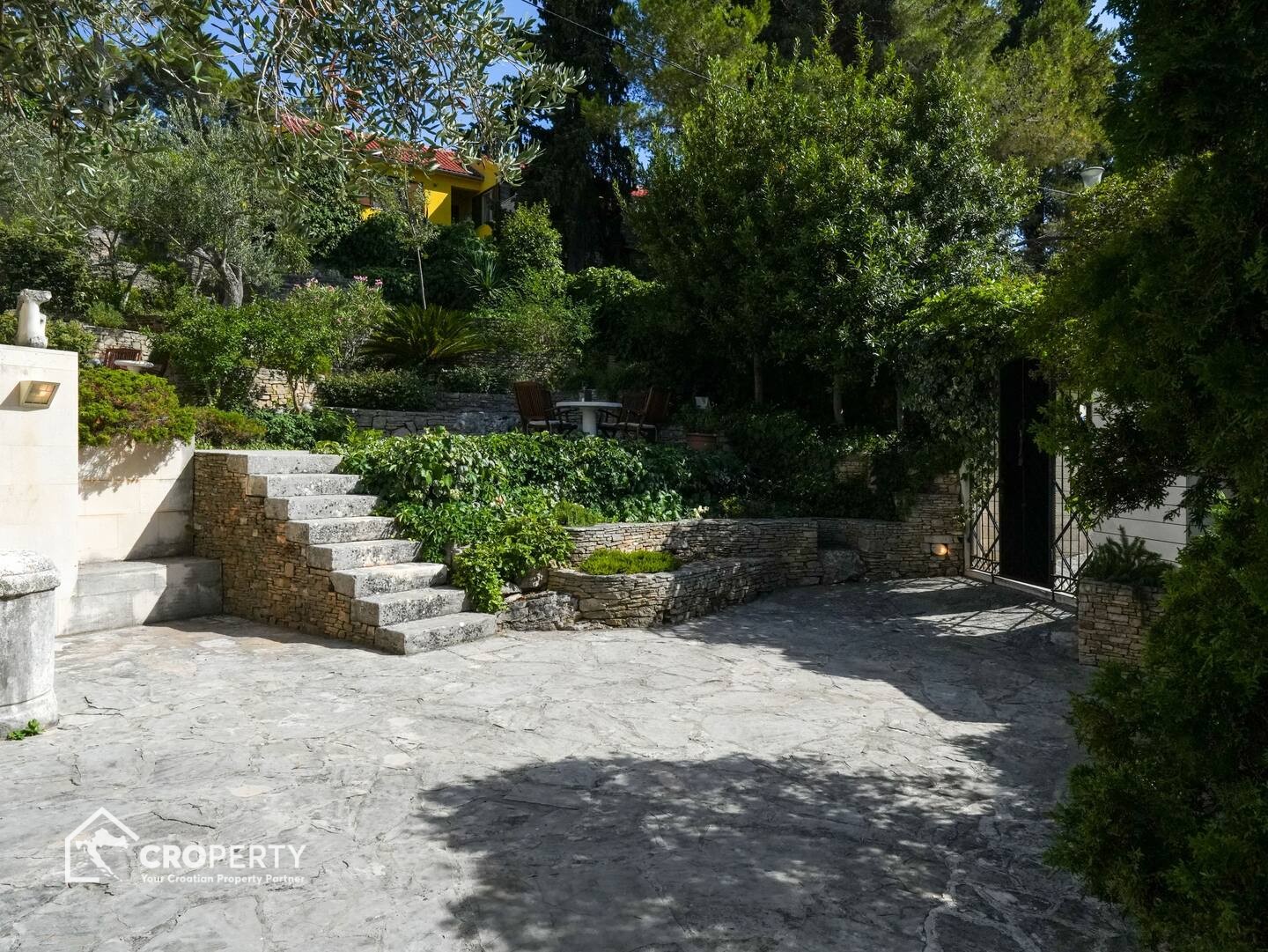 Vanjski prostor je visokim ogradama u kombinaciji zidova i zelenila zaštićen od vanjskog pogleda. Kaskadno je uređen s likovno pomno sazidanim kamenim zidovima na temu uredne suho-zidne gradnje i s kamenim podovima te hortikulturno uređenim vrtom. Uz to u vrtnom djelu postoji pet stabala maslina, te po jedna voćka limuna mjesečara, naranče, grejpa, kunkvaja, smokve, planike i tri stabljike kivija. Glavni ulaz (postoji i pomoćni) natkriven je divljom i pitomom lozom bijelog grožđa.