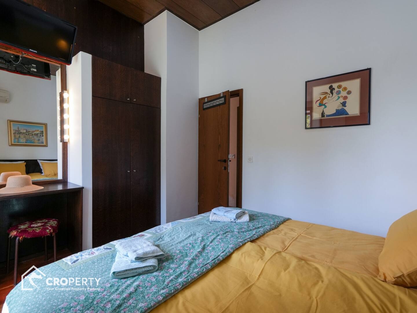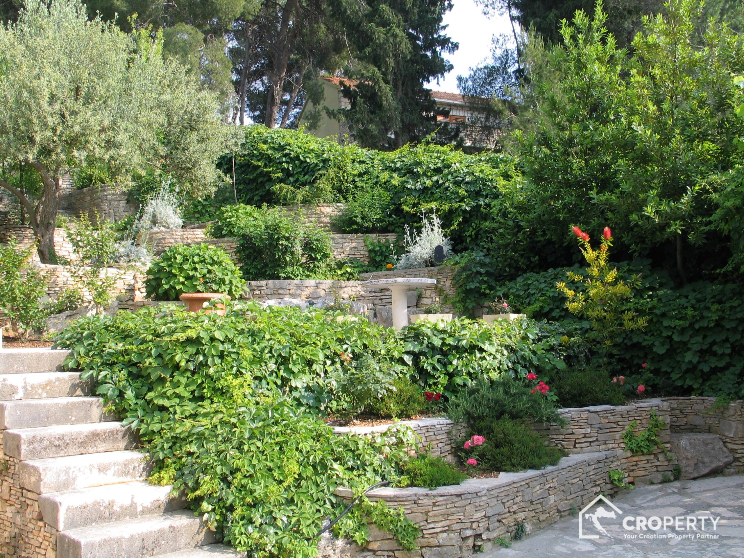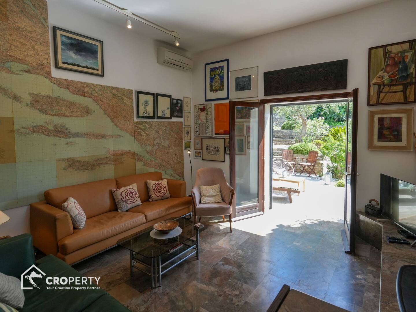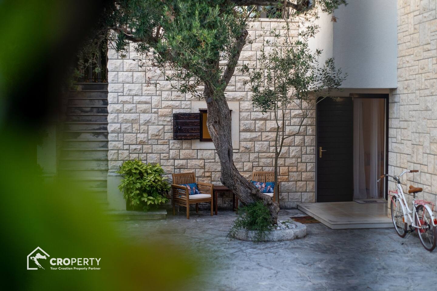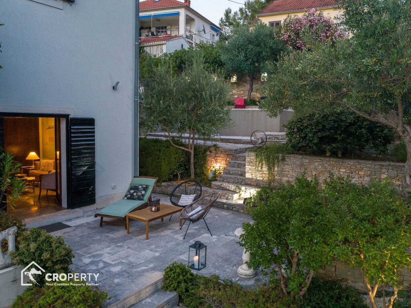 Vanjski prostor je visokim ogradama u kombinaciji zidova i zelenila zaštićen od vanjskog pogleda. Kaskadno je uređen s likovno pomno sazidanim kamenim zidovima na temu uredne suho-zidne gradnje i s kamenim podovima te hortikulturno uređenim vrtom. Uz to u vrtnom djelu postoji pet stabala maslina, te po jedna voćka limuna mjesečara, naranče, grejpa, kunkvaja, smokve, planike i tri stabljike kivija. Glavni ulaz (postoji i pomoćni) natkriven je divljom i pitomom lozom bijelog grožđa.